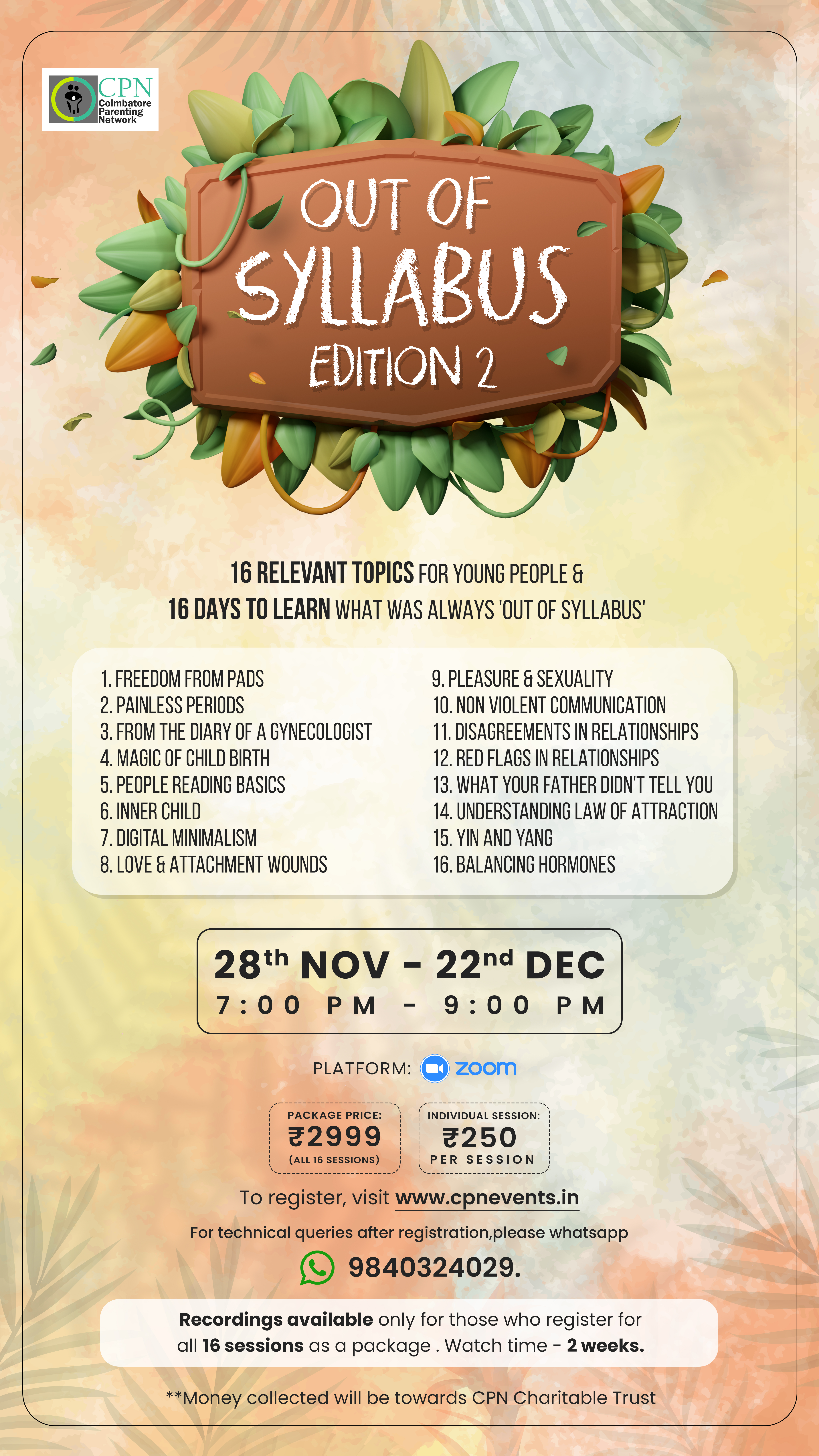 Schooling comes as a big onus on the parents.Mode of schooling, when to start schooling, the curriculum, the environment and we guess the list is endless. In fact, parents start pondering on this part of their parenting journey right from pregnancy. Minu Gnanamoorthy, CPN trustee, will open up on the various types of schooling methods and all the associated factors. At the end, schooling is all about what works for the child.